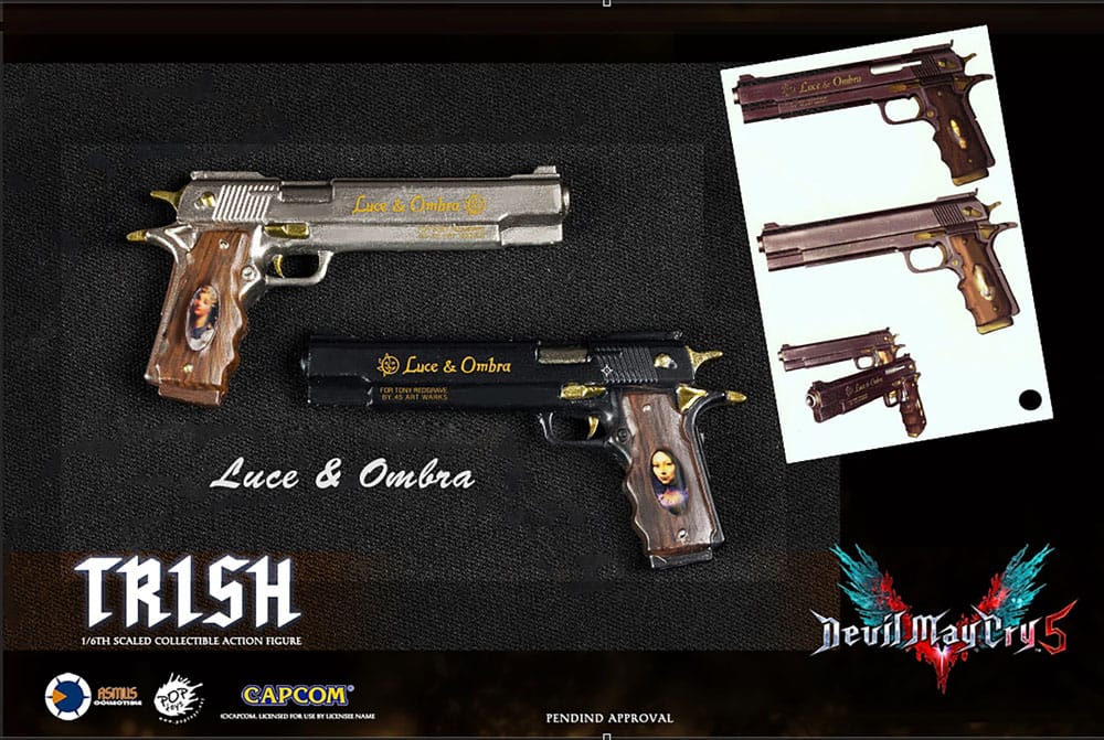 The Trish Sixth Scale Figure features many accessories and weapons. This video game collectible includes the pair of guns Lice nd Ombra as well as the Devil Arm, Sparda!