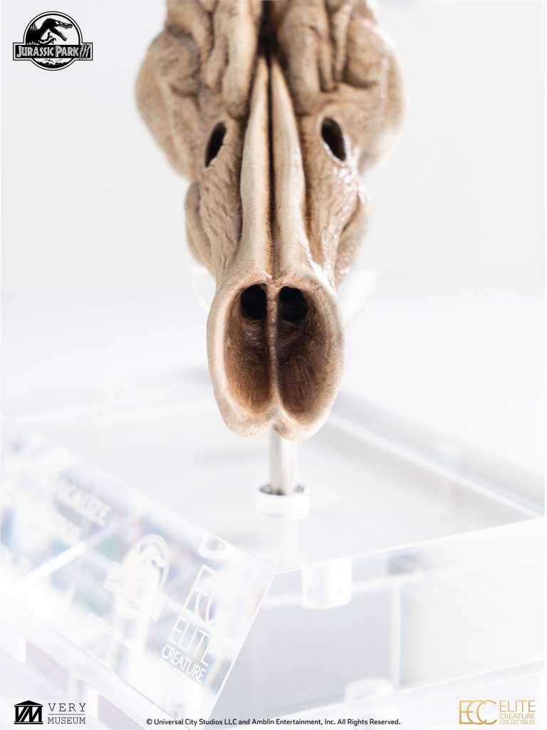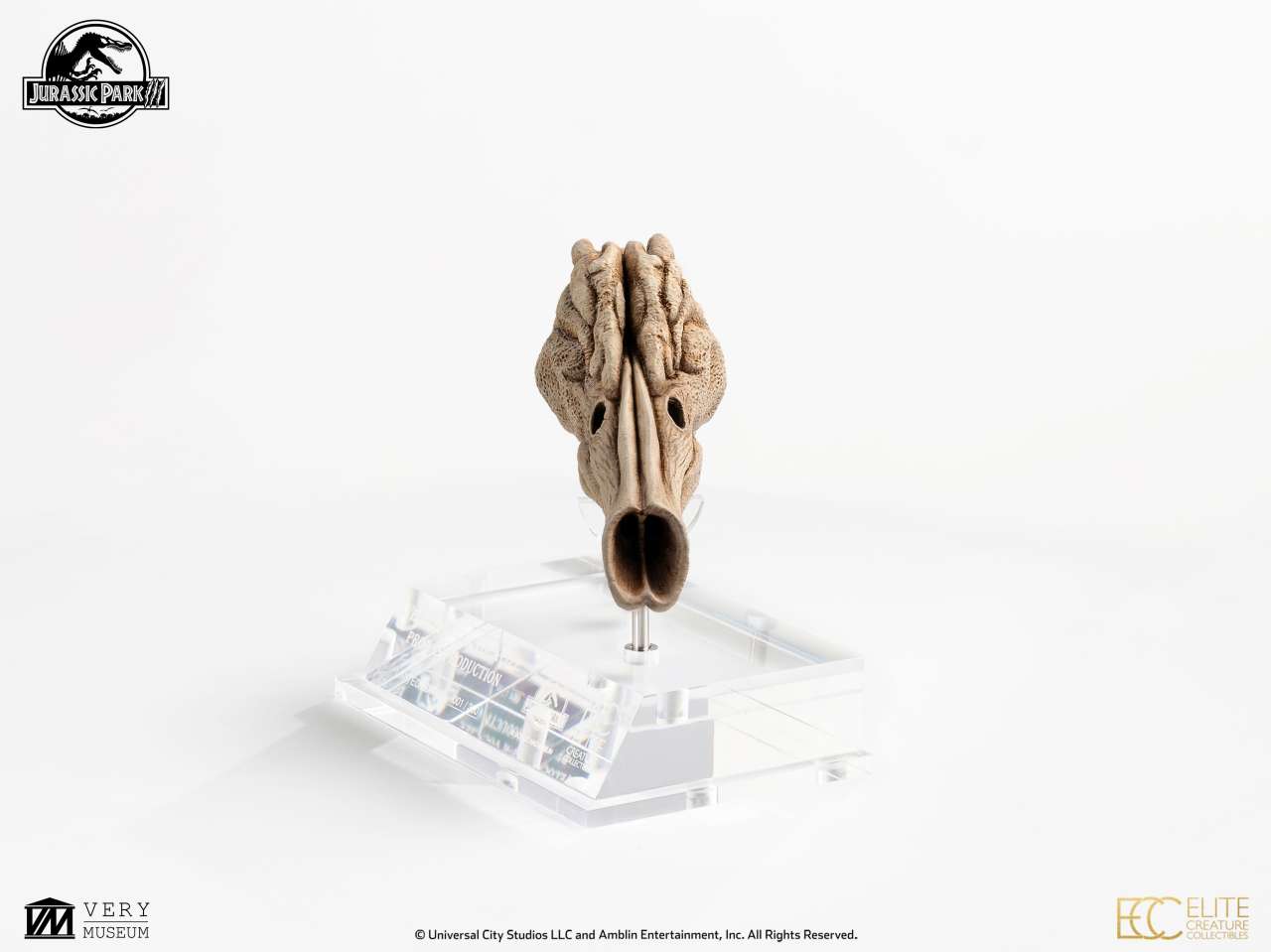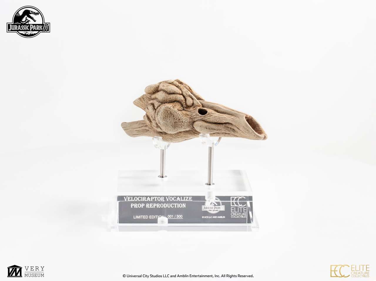 Elite Creature Collectibles è orgogliosa di presentare questa riproduzione della Camera di Risonanza del Velociraptor come parte della nuova collezione di oggetti di scena cinematografici dedicata al franchise di Jurassic Park. Creata con accesso diretto al prop originale utilizzato sul set e perfezionata dagli artisti Mavis e Oskar Ankarudd, questa replica viene presentata su una base espositiva in acrilico in stile asta ed è completamente rimovibile dal supporto.