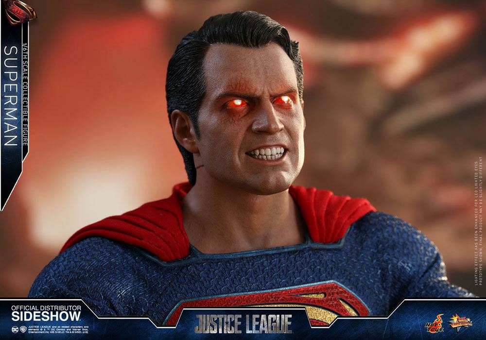 Expertly crafted based on Henry Cavill's appearance in the movie with astonishing likeness, the Superman collectible figure features a newly developed LED light-up head sculpt that accentuates Superman's unique heat vision ability coming from the eyes as well as an interchangeable newly painted head sculpt, a newly developed muscular body, a finely detailed and meticulously tailored costume with metallic superman icon on chest, and a specially designed Justice League themed figure stand.