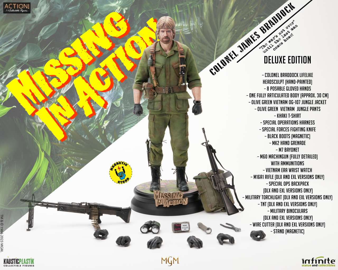 Da Infinite Statue & Collectibles e Kaustic Plastik l’action figure di Missing in Action Colonel James Braddock Deluxe Edition. Realizzata e dipinta a mano con cura meticolosa e grandi dettagli, l’action figure è in scala 1/6 con vestiti in stoffa e include accessori e parti intercambiabili esclusivi per questa versione Deluxe.