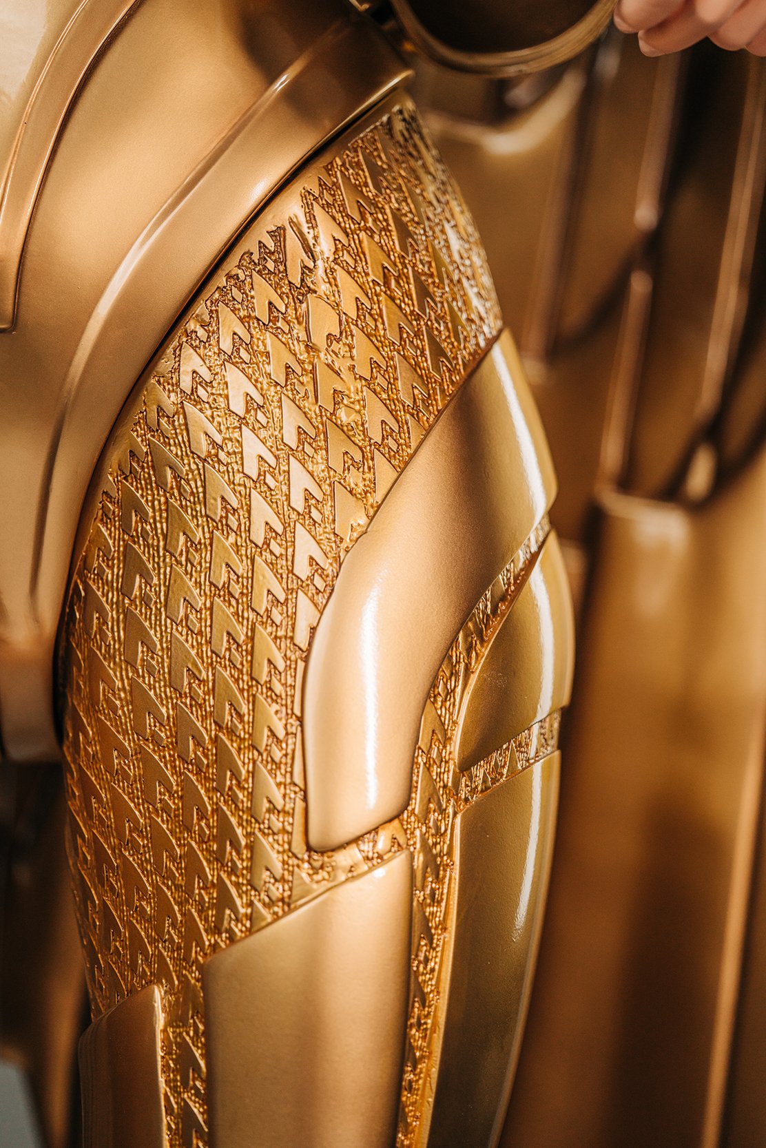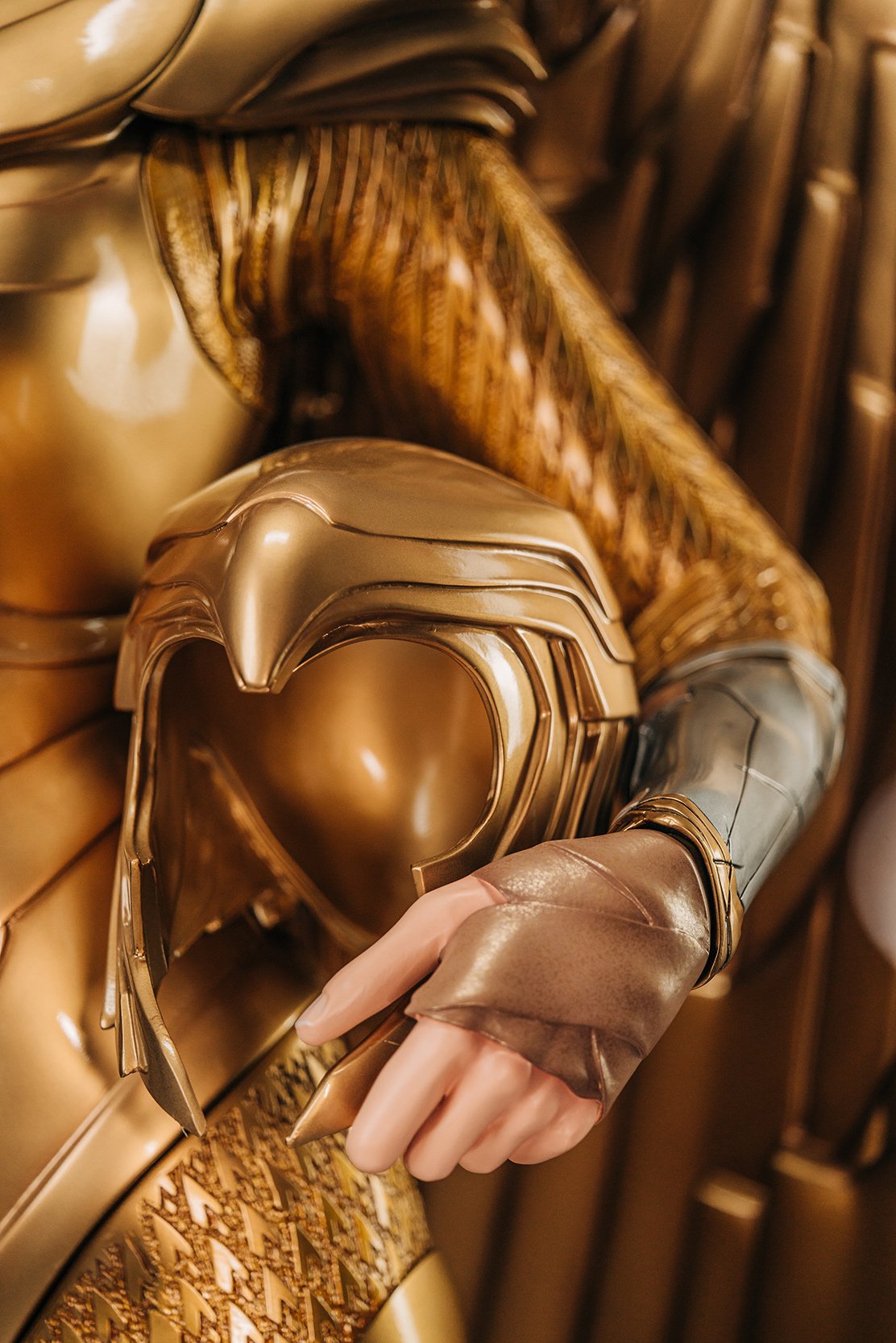 Hand-painted fiberglass and resin life-size statue of a Modern Age Gal Gadot as Wonder Woman, wearing the Golden Eagle Armor and holding her helmet, accented with airbrushing, full-color decals and imprinting, based on her appearance in the Wonder Woman 1984 (also known as Wonder Woman 2) (2020) feature film, atop a Wonder Woman symbol base with applied full-color graphic decals.