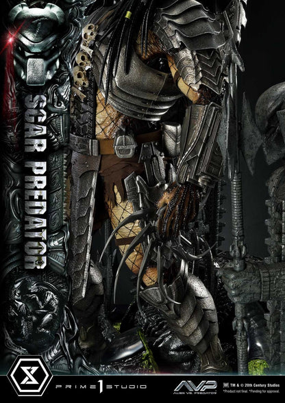Once again, the incredible artisans at Prime 1 Studio brought their A-game to bring this imposing and fearsome extraterrestrial hunter to life. At a whopping 36 inches tall, Scar is fully armored and equipped with an arsenal of advanced technology and brutal instruments of death. As usual, the immense dedication and attention to detail from our artisans and sculptors that went into crafting this remarkable Predator statue ensures the utmost level of accuracy. From each single strand of dreadlock to the tiny Xenomorph skulls and the shading of the skin and armor. You will definitely see and feel our commitment to perfection with this piece! The iconic Bio-Mask, features a distinctive mark on the forehead, referring to his name ''Scar''. The Plasmacaster is ready to unleash its devastating energy blasts on any prey that's unlucky enough to be targeted by the helmet's targeting lasers, both of which are LED illuminated a bright blue and red, respectively. He holds in his right hand the Combistick, a spear-like weapon that serves to impale victims from a distance. In contrast, the gauntlet-integrated Wristblade, in its retracted state, is designed for close-quarters combat, allowing him to slice through flesh and bone with brutal efficiency. His left hand is equipped with a massive Shuriken, absolutely lethal when thrown. The Wrist Gauntlet is also equipped with LED illuminating functions. The base features ancient Yautja-constructed ruins and the corpse of a Facehugger that has been freshly slain. We have also included a second head, without the Bio-Mask to display Scar's true face, and a head base for display. A silver ''AVP'' logo plate is also included for display at the statue's base.