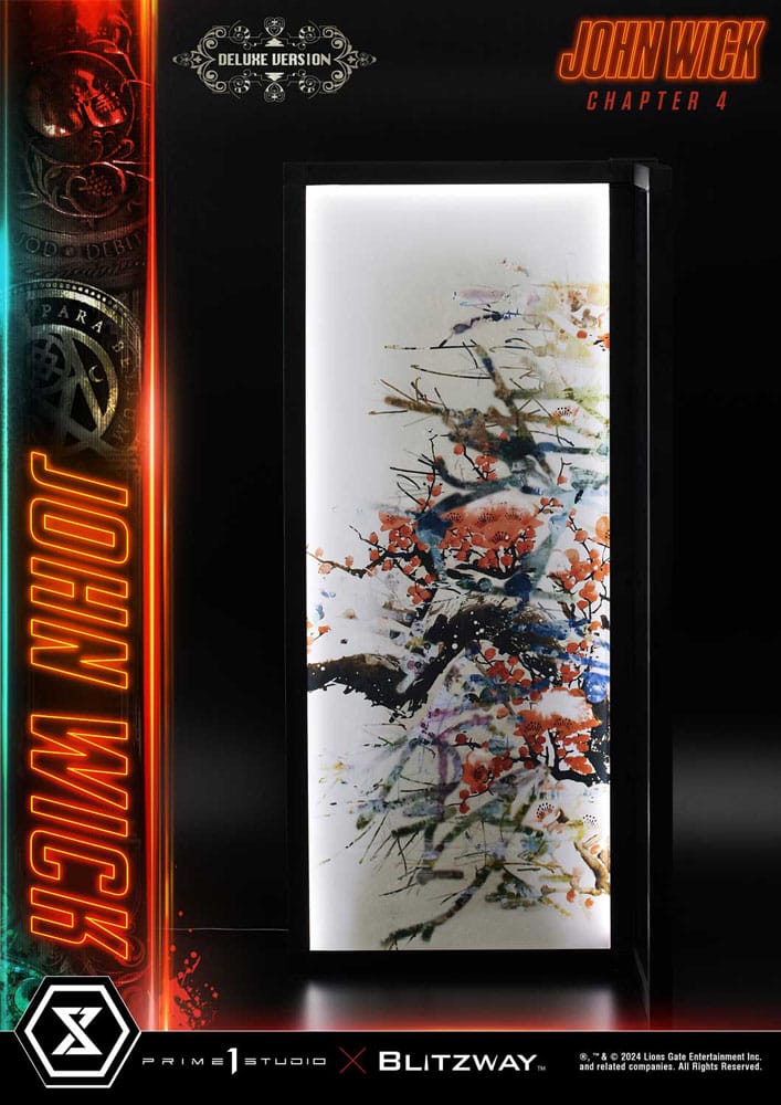 Prime 1 Studio is extremely proud and thrilled to introduce our next entry to the coveted Premium Masterline series, the 1:4 scale PMJWK-01DXS John Wick Deluxe Bonus Version, from his last adventures in Chapter 4! Immerse yourself in the relentless world of action and vengeance with this jaw-dropping reproduction of John Wick, the legendary assassin from the acclaimed John Wick series. Known for its intense action sequences and compelling storytelling, the John Wick franchise has captivated audiences worldwide. With Keanu Reeves delivering iconic performance in all four movies, it is only natural that we at Prime 1 Studio, in collaboration with Blitzway, push ourselves to the limit by bringing you yet another stunning piece of art. At 21 inches tall, the Boogeyman is dressed in his signature black suit, that has been meticulously crafted and sewn with real fabric. He stands in a menacing pose, exuding a stylish, yet menacing aura. With a gun in his right hand, and a katana in his left, he is poised and ready for action. Every detail, from the texture of his suit, to the determined look in his eyes, has been expertly sculpted to bring John Wick to life. The likeness to Keanu Reeves is just uncanny, showcasing the craftsmanship and dedication that went into creating this masterpiece. The base features LED illumination, adding an extra layer of moody ambiance. The Deluxe Version adds a separate Art Wall, also LED illuminated, carefully recreated traditional Japanese paintings, as featured in the Osaka Continental's exhibition hall, where the encounter between the two assassins went down. The Bonus Version, when ordered from our official store or any other authorized distributor, adds another swappable left-hand part, allowing you to display John Wick holding a pair of lethal nunchakus. This piece is more than just a collectible, it is a tribute to the enduring legacy of the character who has redefined the action genre. Elevate your collection with this exquisite statue, as it will make for a striking centerpiece that embodies the relentless spirit of Baba Yaga himself, a must-have for any fan of the series. Pre-order the PMJWK-01DXS John Wick Deluxe Bonus Version now and stay on the lookout for its companion piece, PMJWK-02DXS Caine, soon!" Product Specifications: - Statue Size approximately 23 inches tall with Art Wall [H:58cm W:27cm D:27cm] - Highly detailed likeness sculpture of Keanu Reeves - Sophisticated tailored and designed outfits - LED Illuminated Base - LED Illuminated Art Wall - Two (2) Swappable Left Hands (Normal, Holding Katana) - Two (2) Swappable Right Hands (Normal, Holding Handgun) - One (1) Swappable Left Hand (Holding Nunchuck) [BONUS PART]Informazioni aggiuntive: