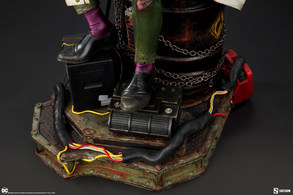 La statuetta dell'Enigmista in formato Premium misura 49,5 cm di altezza, 29,5 cm di larghezza e 36,5 cm di profondità, mentre un egocentrico Edward Nygma provoca Batman dall'alto di un barile laccato nero. Muscoloso e sociopatico, il maestro stratega tiene in una mano un buon vecchio indovinello di carta e nell'altra un detonatore. L'Enigmista si è messo di proposito al centro dell'attenzione in questo magazzino arrugginito. Indizi e minacce, tra cui filmati di sicurezza e progetti della Wayne Tower, una tastiera elettronica, un bastone con punto interrogativo, generatori, fusti di benzina, catene e fili, sono ammucchiati. Ora l'Enigmista ha Batman proprio lì dove può vederlo mettere insieme tutti i pezzi del puzzle... o morire nel tentativo.