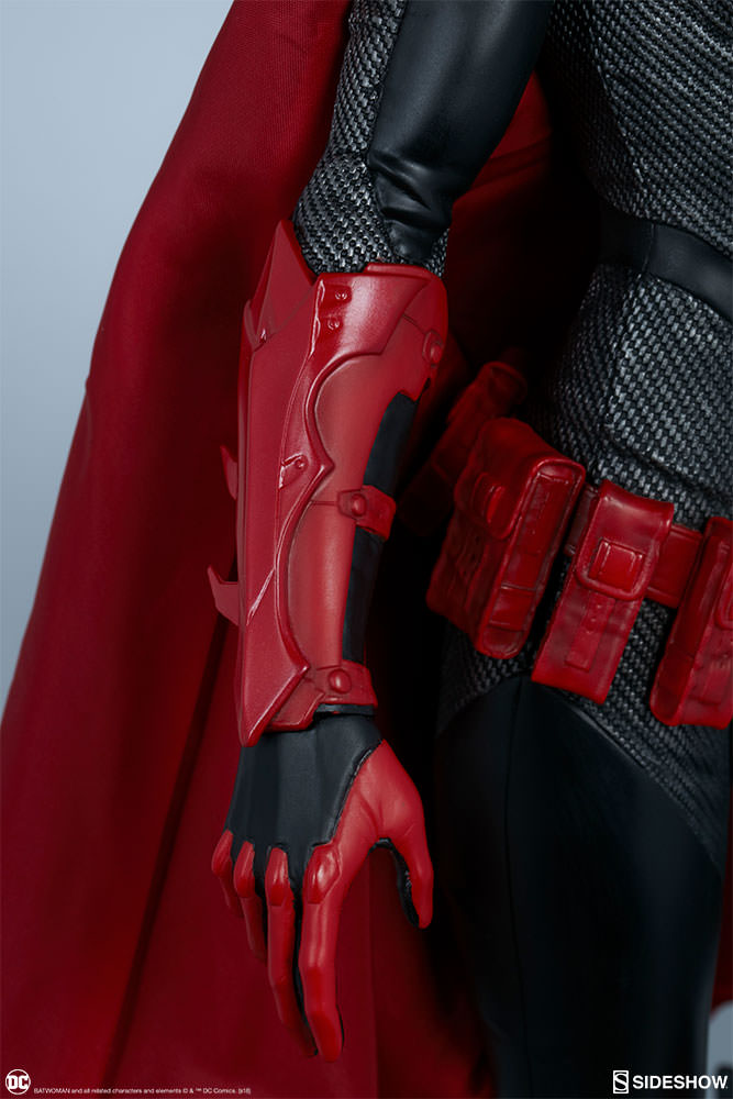 Batwoman’s striking red and black costume mixes military grade armor and weaponry into its sleek design. Her sculpted suit has unique textures and detailing to reflect the reinforcement of her armor, which is emblazoned with a vibrant red bat symbol on the chest. Batwoman is equipped with a utility belt, boots, gloves, gauntlets, and a grappling hook all in her signature style. She also has a tailored fabric cape with a black exterior and red inner lining, and wiring to allow custom cape poses when displaying the piece.
