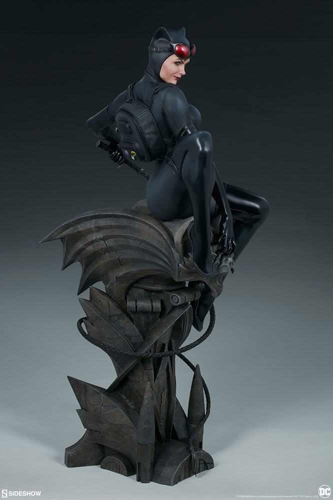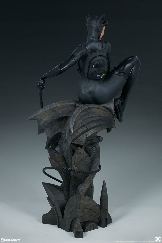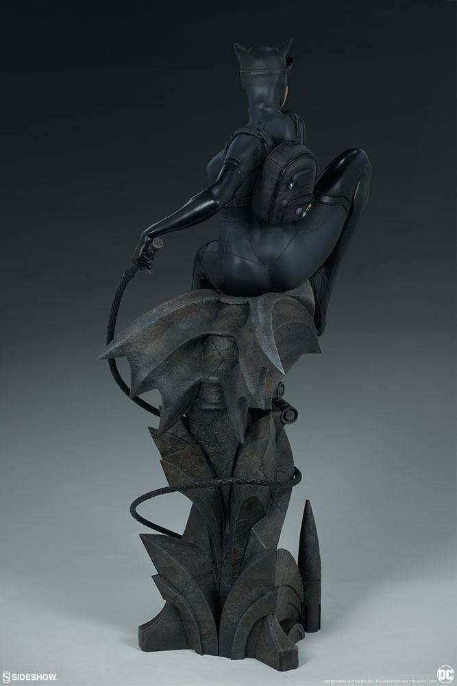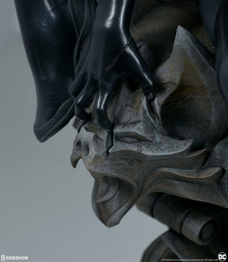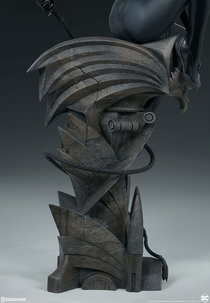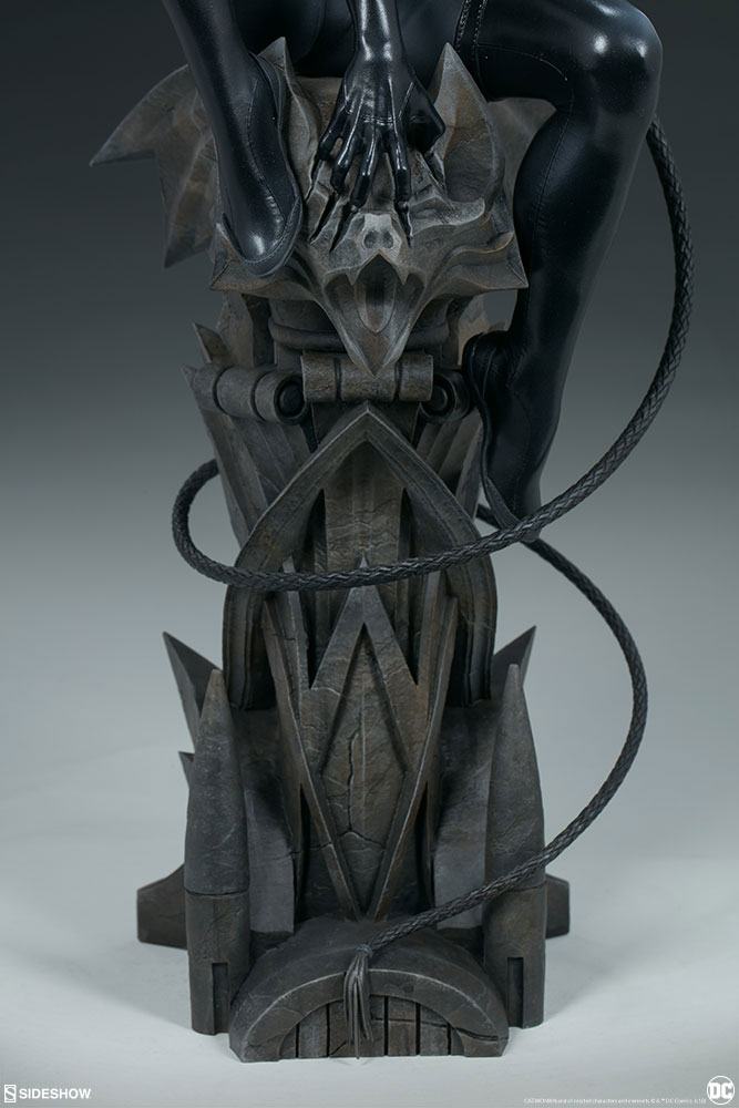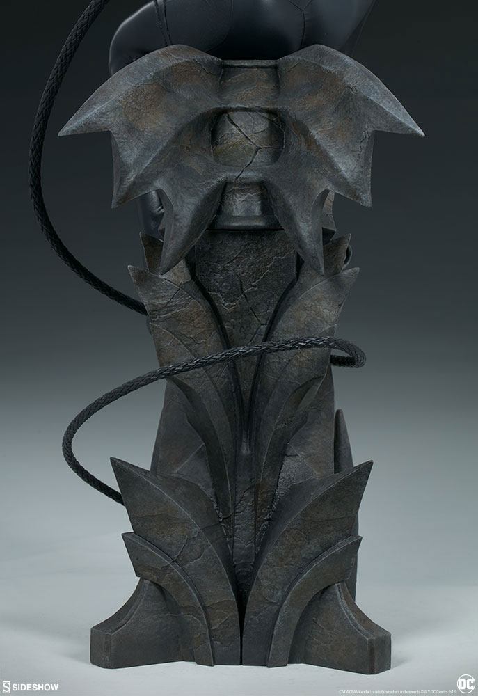 The Catwoman Premium Format™ Figure measures 22" tall as Gotham's feline femme fatale sits perched atop an art deco gargoyle base. Catwoman has her claws sunk deep into the stone bat's snout while her signature bullwhip curls down the pillar.