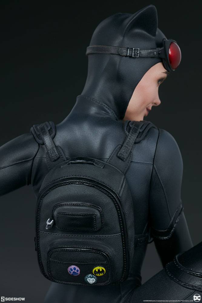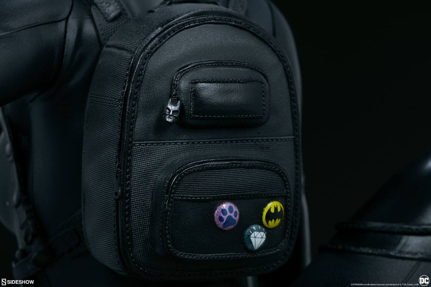 The polyresin Catwoman Premium Format™ Figure features an intricately sculpted catsuit, with varying matte and gloss textures to simulate the different elements of her outfit. Every stitch, zipper, and seam is carefully sculpted to capture lifelike detail in Catwoman's costume. She also comes equipped with a sculpted black backpack with flair, and her cat-eared cowl and red domino goggles.