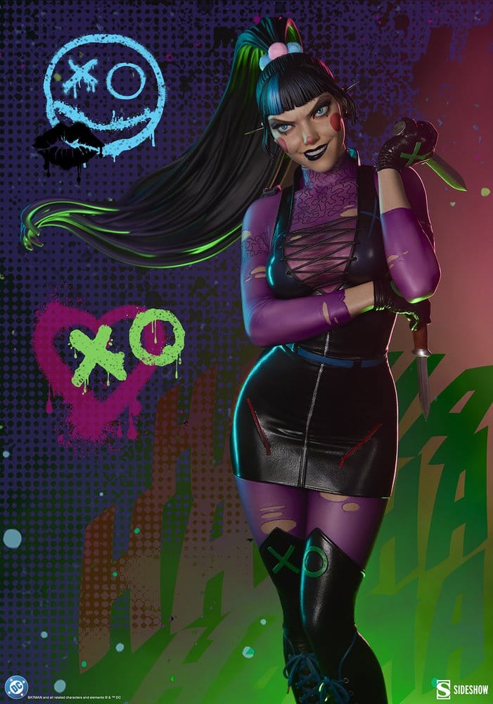 Sideshow e Warner Bros. Discovery Global Consumer Products (WBDGCP) presentano la Punchline™ Premium Format™ Figure. Questo oggetto da collezione con licenza ufficiale DC raffigura un'astuta groupie di clown in una luce caotica e colorata. È un mondo folle, e lei è la soluzione. La Punchline Premium Format™ Figure misura 55,2 centimetri di altezza, 28,2 centimetri di larghezza e 20,5 centimetri di profondità, e raffigura Alexis Kaye che si ritaglia un posto nella cerchia dei cattivi di Gotham City. Amante e odiatrice allo stesso tempo, prende ispirazione per il suo costume e il suo trucco da Joker™ mentre tortura le versioni giocattolo distrutte di Harley Quinn™ e Batman™ - beh, ogni fan ha bisogno di un hobby. Ispirata all'aspetto del personaggio nell'arco narrativo "The Joker War", questa statua da collezione completamente scolpita raffigura Punchline con una tuta viola strappata, un abito nero con corpetto a corsetto, stivali neri al ginocchio e un piccolo mantello nero. Impugna la sua arma preferita nella mano destra, in piedi su un piedistallo circolare che ricorda un battiscopa in legno e ottone ossidato. La statua DC in scala 1/4 include due volti: uno neutro ed enigmatico, l'altro malizioso, che rivela il piacere che Punchline trae dal suo status di supercriminale. Ogni espressione è accompagnata da una lunga coda di cavallo alta con una ciocca blu acceso. Dai un tocco radicale alla tua collezione e porta a casa oggi stesso la statua Premium Format™ di Punchline di Sideshow!