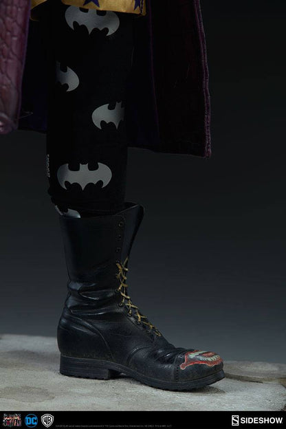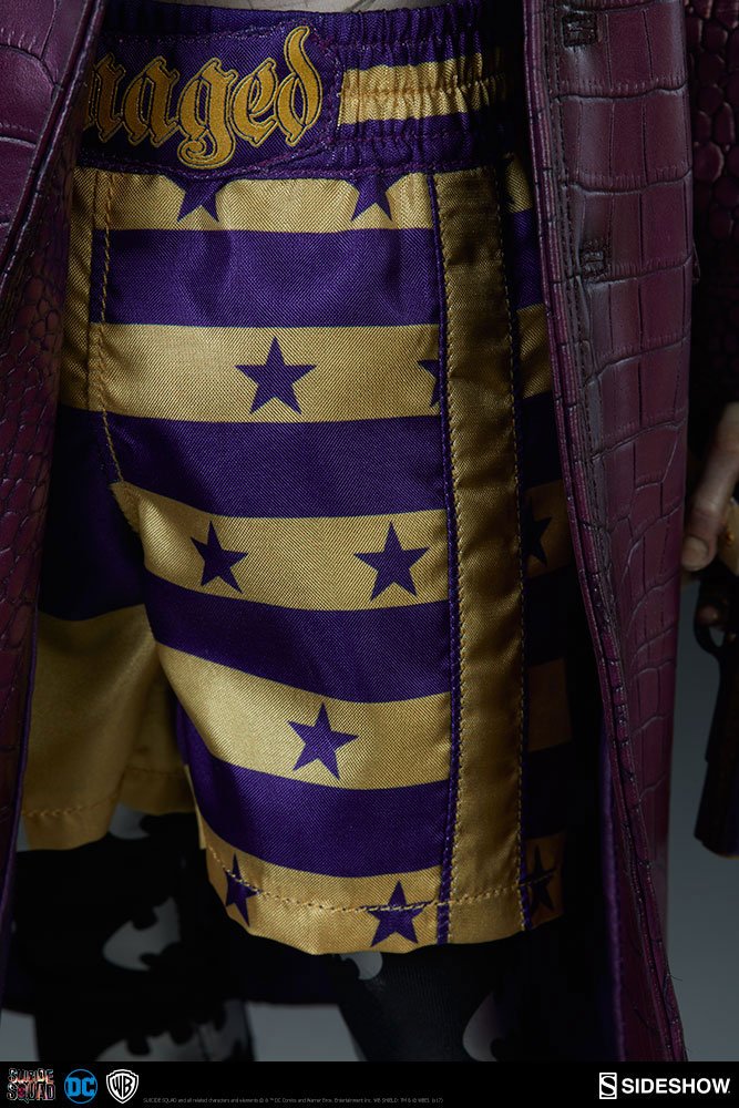 The Joker is holding a jeweled cane over his shoulder with a gun at his side. He is decked out in silver and gold flair like rings, chains, and grills on his teeth, while a variety of detailed tattoos cover him from head to toe. The Joker Premium Format Figure features mixed media elements, sporting a tailored purple faux-alligator coat, purple and gold fabric boxers, and Batman-themed leggings.